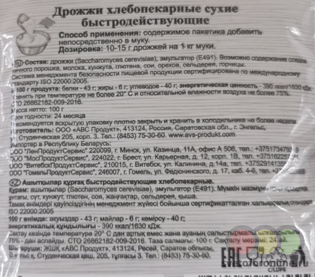 Дрожжи быстродействующие 100г - Купить в магазине "Светофор" город Козловка, ул Сетевая, д 5